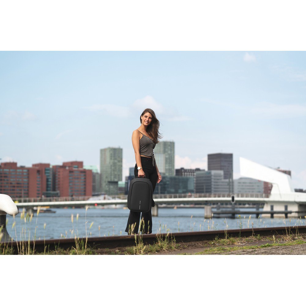Plecak chroniący przed kieszonkowcami Bobby Hero Small, wodoodporny i odporny na przecięcia materiał, wykonany z przyjaznego środowisku materiału RPET, ukryte zamki i kieszenie, wewnątrz miękkie przegrody na laptopa do 13,3" i tablet do 12,9", zintegrowany port USB do ładowania telefonów (power-bank nie jest dołączony), odblaskowe paski zwiększające widoczność, pasek do zamocowania na walizce, wzór zastrzeżony®, ślad węglowy produktu: 6,28 kg CO2