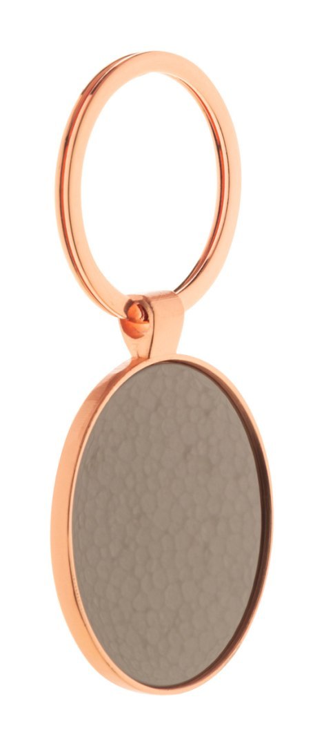 Okrągły metalowy brelok do kluczy w złotym wykończeniu z brązową płytką. W pudełku z papieru kraft.