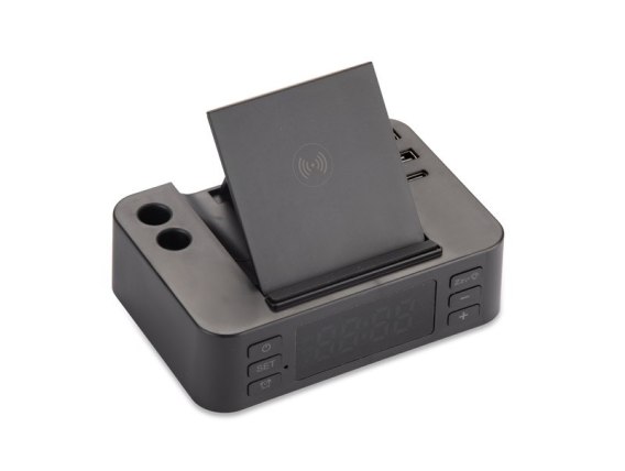 Budzik z ładowarką indukcyjną CLOCKI to funkcjonalny gadżet reklamowy, który sprawdzi się na biurku lub stoliku nocnym. Posiada trzy wejścia USB (USB, USB, USB-C) oraz miejsce do ładowania bezprzewodowego. Telefon można ładować zarówno na leżąco, jak i w pozycji stojącej dzięki rozkładanemu stojakowi. Dodatkowo, budzik oferuje dwie przestrzenie na długopis lub inne przybory. W zestawie znajduje się kabel USB-C, co czyni go kompletnym rozwiązaniem do codziennego użytku.