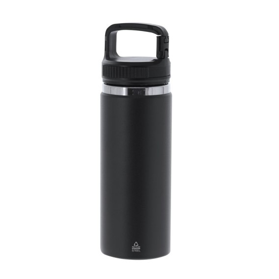 Butelka termiczna 550 ml z karabińczykiem umożliwiającym przypinanie, posiada podwójne ścianki, które spowalniają oddawanie temperatury na zewnątrz, produkt wykonany ze stali nierdzewnej z recyklingu