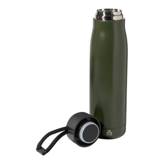 Butelka z podwójną ścianką, izolowana próżniowo, wykonana z recyklingowanej stali nierdzewnej, z pokrywką PP i zintegrowanym paskiem do noszenia. 500 ml.