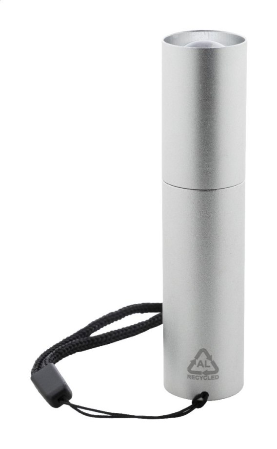Latarka z recyklingowanego aluminium z wbudowanym akumulatorem USB (400 mAh) i paskiem do noszenia. Z regulacją jasności i mocną latarką COB oraz 3 trybami świecenia. W zestawie kabel USB do ładowania.