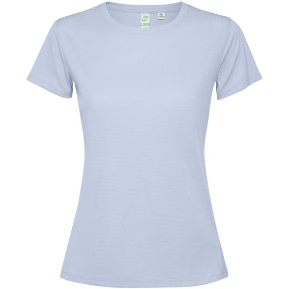 Dopasowana, techniczna koszulka z krótkim rękawem dla kobiet. Kołnierz z pasującymi kolorystycznie szwami. Tył nieco dłuższy niż przód. Szwy boczne przesunięte do przodu.