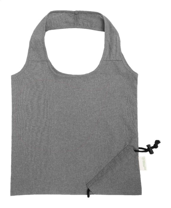 Składana torba na zakupy wykonana w 70% z bawełny pochodzącej z recyklingu i w 30% z poliestru RPET, o gramaturze 140 g/m². Z charakterystyczną metką z bawełny pochodzącej z recyklingu.