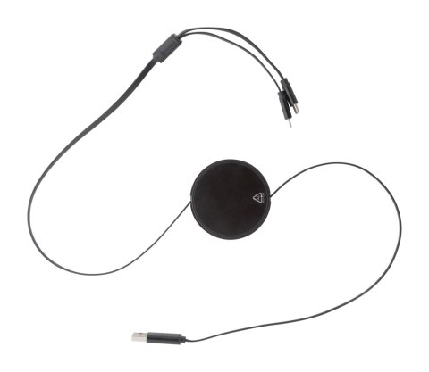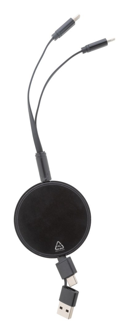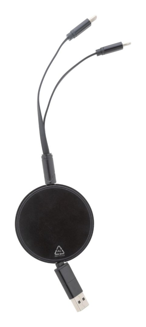 Teleskopowy kabel do ładowarki USB z aluminium pochodzącego z recyklingu. Ze złączami micro USB, USB-C i Lightning. Z wejściami USB i USB-C.
