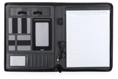 Teczka na dokumenty ze skóry PU z power bankiem 5000 mAh, notatnikiem 20 kartkowym i uchwytem na telefon oraz tablet. W zestawie kabel USB do ładowania.