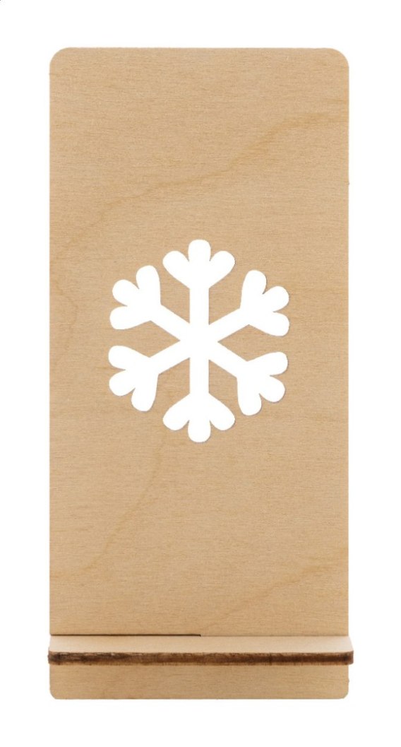 Wykonany na zamówienie, kolorowy uchwyt na telefon komórkowy na biurko, wykonany ze sklejki brzozowej, z wyciętym motywem świątecznym. Cena zawiera nadruk UV LED z przodu. Dostarczany na płasko. Min. ilość: 50 sztuk.