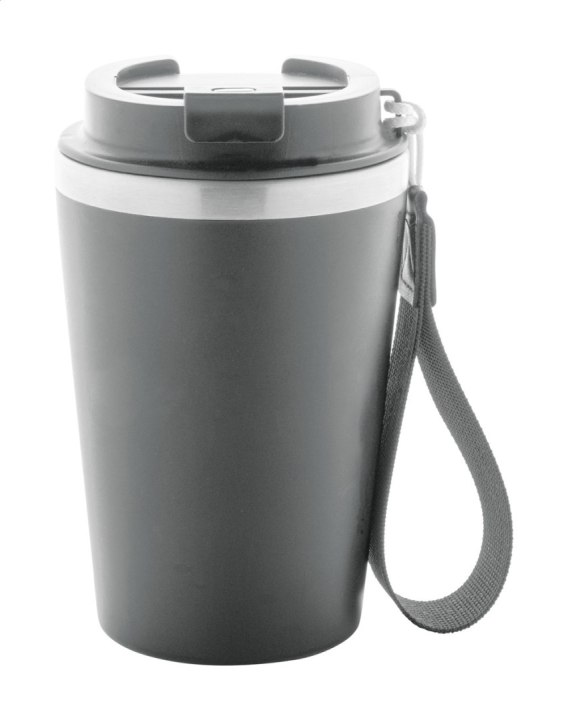 Kubek termiczny z podwójnymi ściankami ze stali nierdzewnej z recyklingu z plastikiem PP na zewnątrz i pokrywką do picia. Z paskiem RPET do przenoszenia. 350 ml.