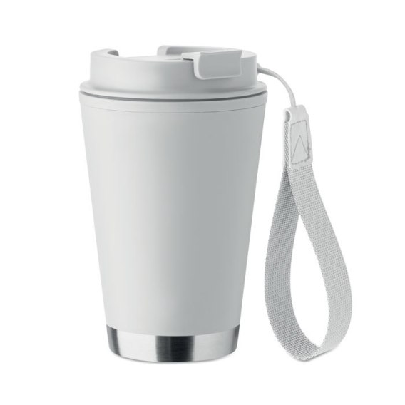 Dwuścienny kubek z wewnętrzną ścianką z PP, zewnętrzną ścianką z PP pochodzącego z recyklingu, detalami ze stali nierdzewnej pochodzącej z recyklingu i paskiem na nadgarstek z RPET. Pojemność: 300 ml.