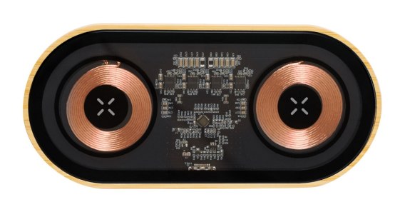Szybka ładowarka indukcyjna z podwójną cewką (15 W) w bambusowej i przezroczystej obudowie z tworzywa sztucznego z widocznymi elementami elektronicznymi. W zestawie kabel do ładowarki USB.
