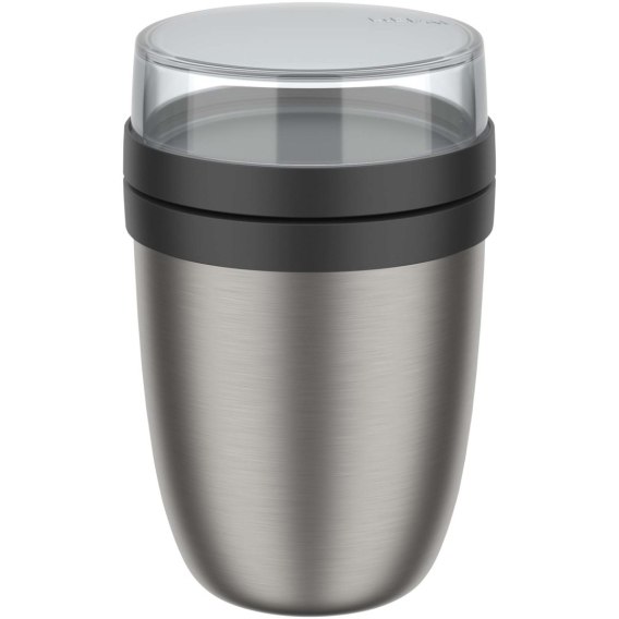 Izolowany pojemnik na lunch z dwiema przegrodami, które pozwalają na oddzielne przechowywanie różnych składników. Oba pojemniki mają oddzielne pokrywki, dzięki czemu składniki nie mieszają się ze sobą. Utrzymuje ciepło potraw przez 6-8 godzin lub zimno przez 12 godzin. Pojemność górnego przezroczystego pojemnika wynosi 200 ml. Pojemność dolnego pojemnika wynosi 500 ml. Wykonane z wytrzymałego materiału, dzięki czemu zewnętrzna strona pojemnika pozostaje chłodna i sucha. Zaleca się mycie ręczne. Plastikowe części nakrętki można myć w zmywarce.