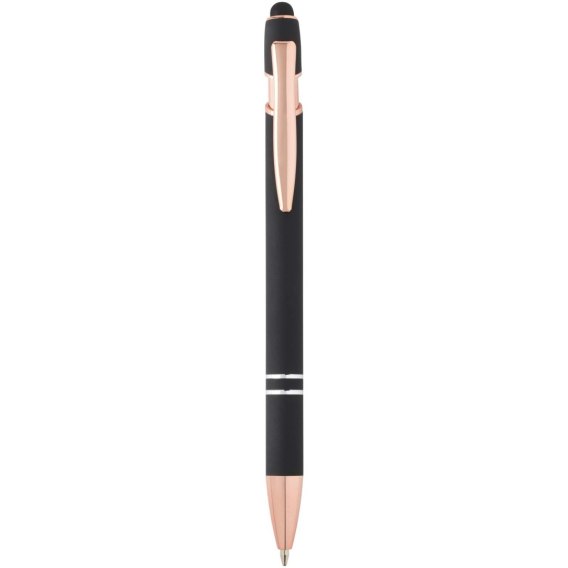 Długopis Nanna z wykończeniem w kolorze różowego złota ma korpus wykonany z aluminium z recyklingu i rysik dotykowy wykonany z silikonu. Aluminium z recyklingu ogranicza ilość odpadów na wysypiskach śmieci i pomaga chronić zasoby naturalne w celu zmniejszenia emisji gazów cieplarnianych. Kolor tuszu: Czarny. Żywotność: 800 metrów. Rozmiar stalówki: 1,0 mm.