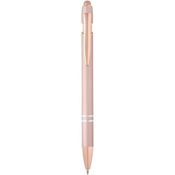 Długopis Nanna z wykończeniem w kolorze różowego złota ma korpus wykonany z aluminium z recyklingu i rysik dotykowy wykonany z silikonu. Aluminium z recyklingu ogranicza ilość odpadów na wysypiskach śmieci i pomaga chronić zasoby naturalne w celu zmniejszenia emisji gazów cieplarnianych. Kolor tuszu: Czarny. Żywotność: 800 metrów. Rozmiar stalówki: 1,0 mm.