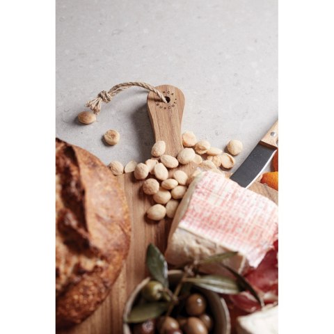 Deska do krojenia, serwowania, z uchwytem, wykonana z drewna tekowego z certyfikatem FSC®, które dzięki swoim naturalnym właściwościom z czasem ciemnieje, dzięki wysokiej zawartości oleju drewno jest bardzo odporne i wytrzymałe