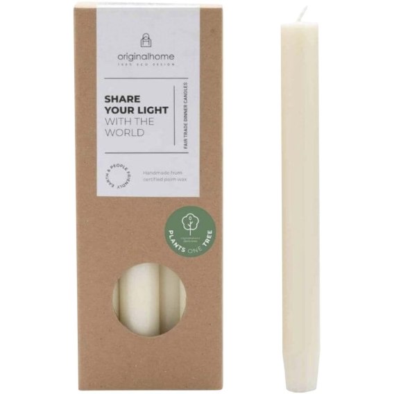 W 100% naturalna świeca obiadowa od Originalhome wykonana ręcznie z certyfikowanego wosku z ziaren palmowych. Zawiera 10 bezzapachowych świec zapakowanych w pudełko upominkowe. Każda świeca pali się około 7-8 godzin.