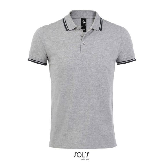 SOL'S PASADENA MEN,Men's Polo Shirt, 100% Ringspun cotton PIQUÉ 200, Rib 1x1 collar and cuffs, Reinforcing tape on neck, Short sleeves, Contrasting stripes on collar and cuffs, Tone on tone 3 button placket, Fitted cut, Cut and sewn, Side slits, Spare button on the inside seam, (1) Grey / Navy : 85 % cotton / 15 % viscose, (2) Grey melange / Orange : 85 % cotton / 15 % viscose. About sizes matching, please refer to the size chart in the product documentation section.