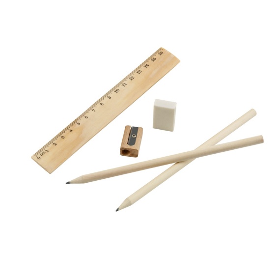 Zestaw do pisania zawiera linijkę 16.5 cm, 2 ołówki grafitowe (HB), 1 gumkę i 1 temperówkę. Zestaw dostarczany w etui z włókniny (80 g/m²) ze ściągaczem. 60 x 265 mm