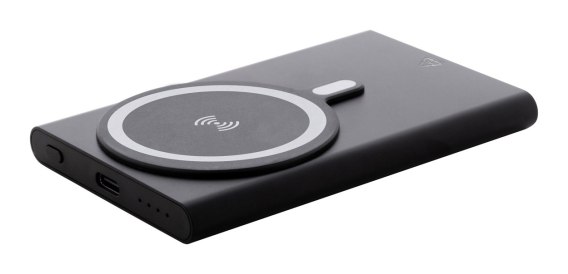 Power bank z aluminium pochodzącego z recyklingu z wbudowaną szybką ładowarką indukcyjną, magnetyczną (15 W) i baterią 5000 mAh. Z wejściem USB-C i portem ładowarki. Zawiera samoprzylepny metalowy pierścień umożliwiający wykorzystanie funkcji magnetycznej na dowolnym urządzeniu ładowanym bezprzewodowo. Kompatybilny z iPhonem® 12 lub nowszym. Zawiera kabel USB.