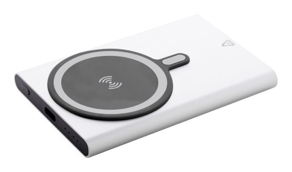Power bank z aluminium pochodzącego z recyklingu z wbudowaną szybką ładowarką indukcyjną, magnetyczną (15 W) i baterią 5000 mAh. Z wejściem USB-C i portem ładowarki. Zawiera samoprzylepny metalowy pierścień umożliwiający wykorzystanie funkcji magnetycznej na dowolnym urządzeniu ładowanym bezprzewodowo. Kompatybilny z iPhonem® 12 lub nowszym. Zawiera kabel USB.
