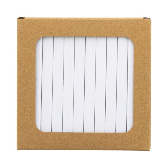 Zestaw 12 prostokątnych drewnianych kredek ołówkowych z białym wykończeniem. W pudełku z papieru kraft z dużym okienkiem. Idealny do nadruku UV LED na całej powierzchni.