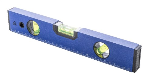 Poziomica magnetyczna wykonana z recyklingowanego aluminium z trzema poziomicami (poziomą, pionową i 45°) i linijką o długości 30 cm.