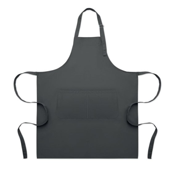 Długi, regulowany fartuch kuchenny z polibawełny 240 gr/m² (35% bawełny, 65% poliestru) z dwiema przednimi kieszeniami i regulowanym paskiem z metalową klamrą.