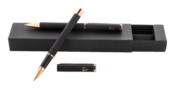 Zestaw długopisów z recyklingowanego aluminium, z długopisem kulkowym i cienkopisem, z gumowanym wykończeniem i detalami w kolorze różowego złota. Z niebieskim wkładem. Ze specjalną powłoką do grawerowania laserowego w kolorze różowego złota. W czarnym papierowym pudełku prezentowym.