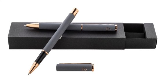 Zestaw długopisów z recyklingowanego aluminium, z długopisem kulkowym i cienkopisem, z gumowanym wykończeniem i detalami w kolorze różowego złota. Z niebieskim wkładem. Ze specjalną powłoką do grawerowania laserowego w kolorze różowego złota. W czarnym papierowym pudełku prezentowym.