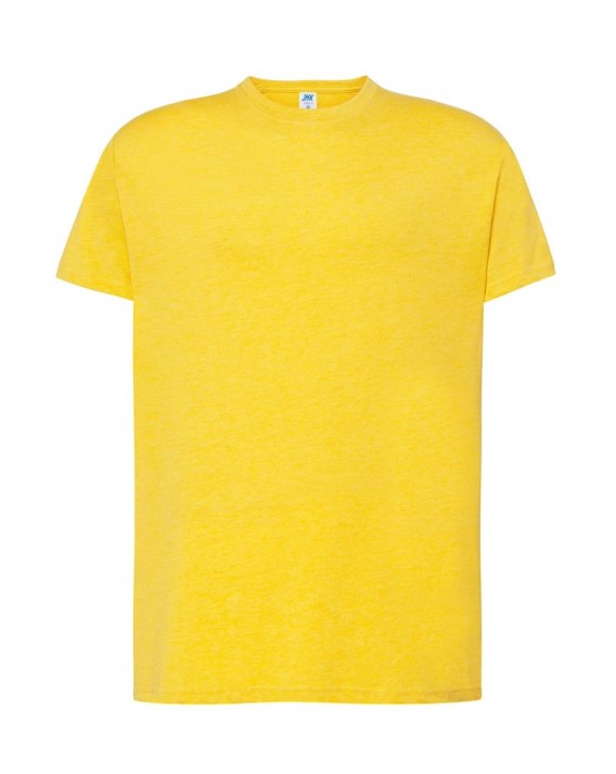 T-shirt męski z krótkim rękawem. Brak bocznych szwów. Podwójne szwy na ramionach. Wzmocniony lycrą ściągacz. Taśma wzmacniająca. 100% bawełna stabilizowana.