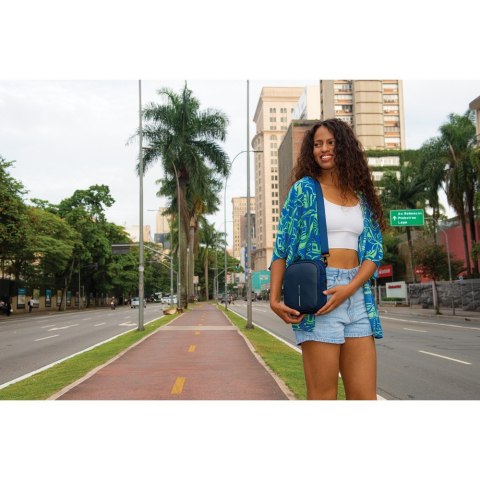 Torba na ramię, saszetka, ukryta kieszeń z tyłu, ukryta kieszeń na butelkę, wykonana z materiałów z recyklingu, dzięki zastosowaniu technologii fizycznych znaczników AWARE™ wykorzystane materiały są identyfikowalne z pochodzenia, ślad węglowy produktu: 2,94 kg CO2