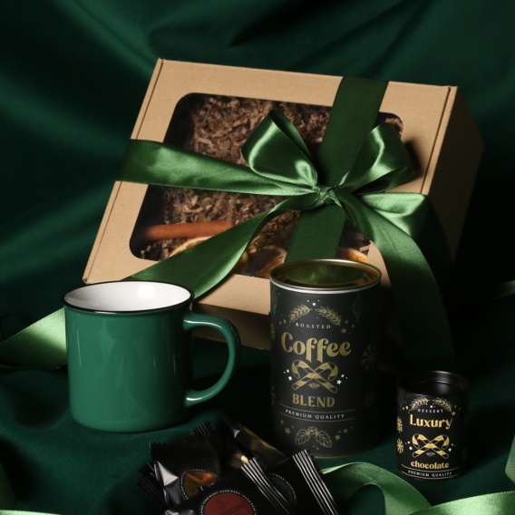 W skład zestawu wchodzą: kubek Loft w kolorze ciemnozielonym lub Loft Supreme w kolorze czerwonym i czarnym z nadrukiem kalka ceramiczna 1 strona 1 kolor. Rozgrzewająca belgijska czekolada do picia 40g, aromatyczna kawa ziarnista Arabica Brazil Cerrado Mineiro w puszce 150g, ekskluzywne ciasteczka studenckie 8 szt. - mix smaków. Wstążka oraz bilecik.