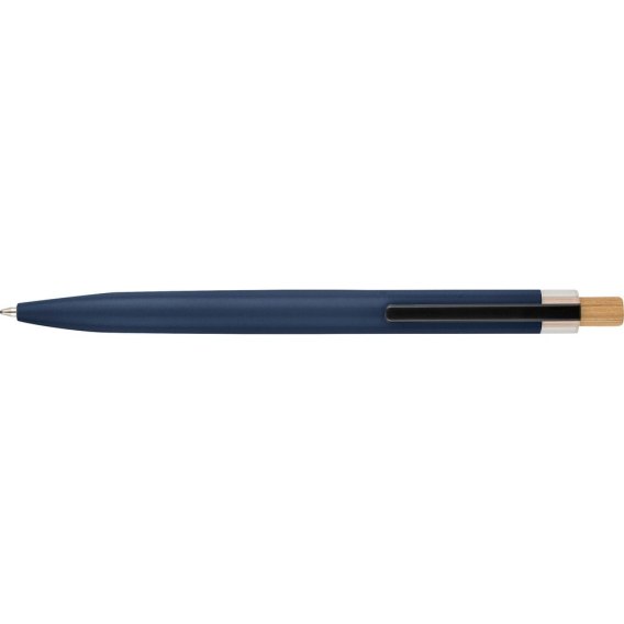 Zestaw piśmienniczy, w którego w skład wchodzi: długopis z bambusowym przyciskiem, ikoną recyklingu na produkcie, metalowym klipsem, tusz w niebieskim kolorze, wystarczający na ok. 700 m pisania, pióro kulkowe z pokrywką, metalowym klipsem, ikoną recyklingu na produkcie, wkład w niebieskim kolorze, wystarczający na ok. 500 m pisania, zapakowany w kolorowe pudełko upominkowe z recyklingu, produkt wykonany z aluminium z recyklingu, RPET i metalu